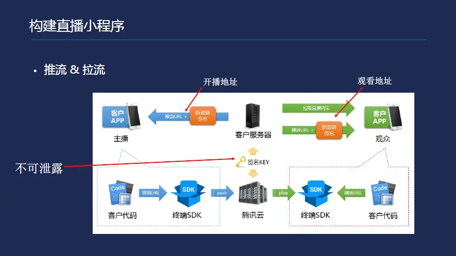 腾讯云申请直播服务以后,腾讯云给签名KEY,上面的服务器就是开发者自己的服务器,通过服务器,例如主播打开直播间,其实就是直播间的房间号,推流的地址主要跟房间一样的地址,肯定会存在风险,有人拿地址传输,就需要腾讯云官方给签名的key,拿到房间号等的推流的url进行签名,给小程序这端。只有主播拿到签名后的地址才能把视频的流推到视频端,如果是别人拿到开发者的地址,没有办法对地址做签名,可能用推流的地址推到腾讯云,这时腾讯云不会接受的。过程会防止倒推流。如果过程需要团队,需要很庞大的团队,通过腾讯云给的服务,很简单的搭建应用。右边是观看的地址,原理跟主播端是一样的,这里面最核心的最重要的是腾讯云给的签名Key,只要签名key不丢给其他的开发者,就没有办法进行签名。