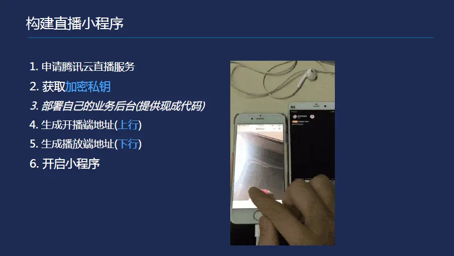 最简单的一种方式需要自己部署自己后台,甚至今晚回去就可以开发直播出来,开发者自己测试可以在腾讯云控制后台,实时推流的地址或者拉流的地址,放到小程序的两端实现观看。如果做庞大的应用,可以做地址分发的逻辑,才需要做的第三步。包括代码的部署,还有自己的业务,有游戏直播,有美女直播等,需要开发者自己业务后端进行处理,音视频的处理交给腾讯云,卡顿与涉黄交给腾讯云处理。举个例子,我自己家里养小宠物,我自己到家里面简单部署监控,我自己家里的小狗小猫,非常容易实现,时间和技术的成本都非常低。