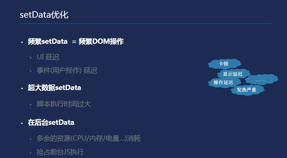 频繁SetData等于频繁DOM操作,超大数据SetData,如果DOM操作非常的紧密,uai会有延迟。一次SetData过程非常慢,小程序进入后台关闭的时候,小程序并没有把线程销毁,其实小程序还存在的微信小程序里面,如果开发者隐藏操作,其实背后是在运行的,这种情况下肯定是消耗开发者的机器资源,界面有问题,显示有延迟,手机发热非常严重,这是在平时的开发过程当中都会遇到问题。