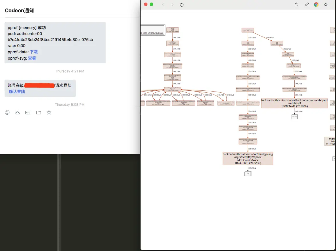 go tool pprof http://POD_LAN_IP:NodePort/debug/pprof/profilegopprof完成profiling后,会自动生成 profile svg 调用关系图,并将profile 数据和调用关系图上传云存储,并向服务的owner推送诊断结果通知: