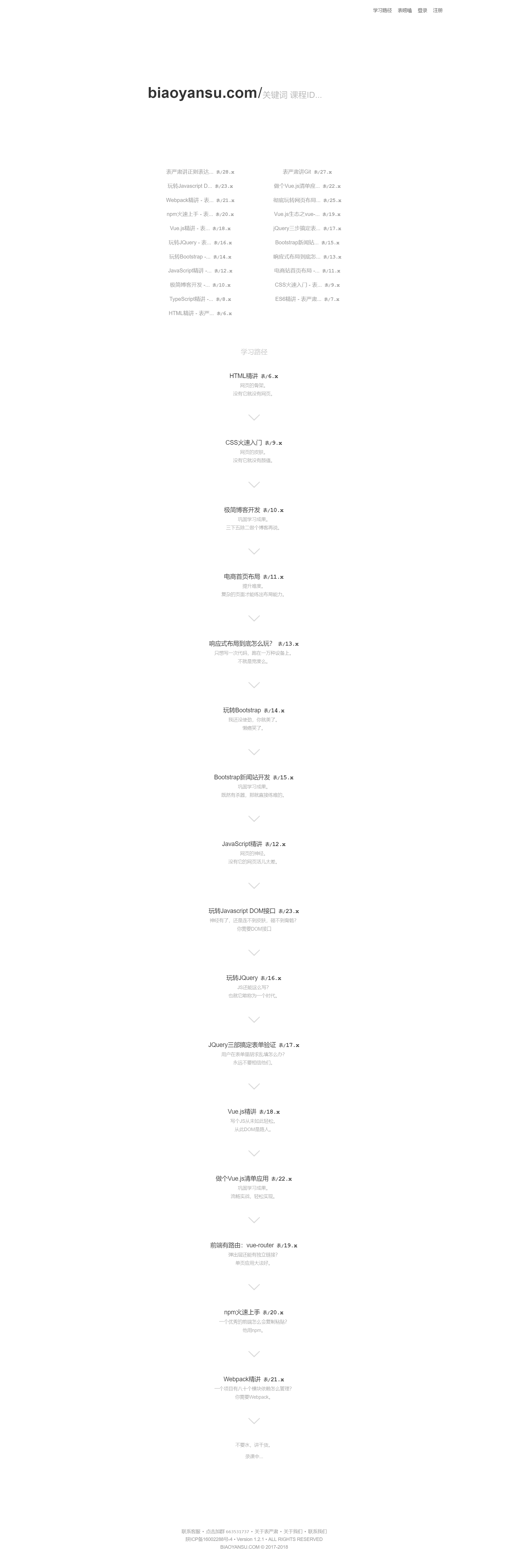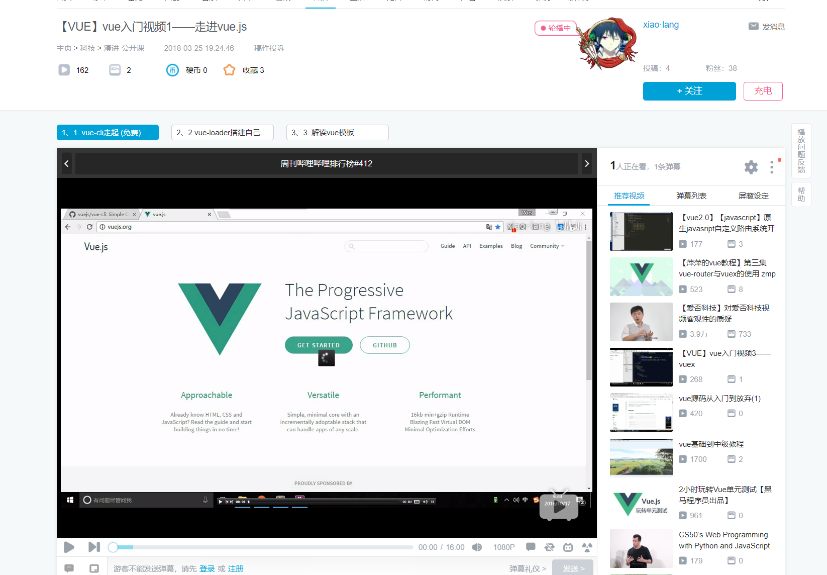 一些不错的讲前端vue的网络上的视频 广顾dun 2018-05-14 311 阅读1分钟 1.https://www.bilibili.com/video/av21214236/?p=1[vue入门视频1——走进vue.js] 这个bilibili的视频讲解vue-cli脚手架搭建还不错,可以看看2.https://space.bilibili.com/44076852/#/这个bilibili的主播"表严肃"讲的前端的知识挺好,比如vue, jq,js他的个人网站很好:biaoyansu.com_要多看多涉略