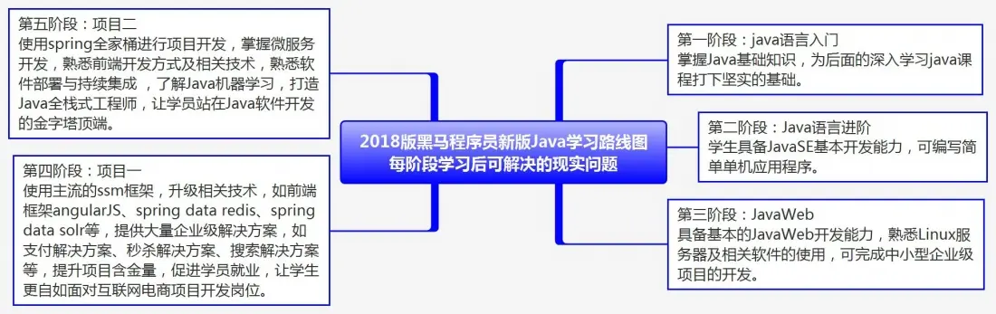 播妞深知广大爱好Java的人学习是多么困难,没视频没资源,上网花钱还老担心被骗。因此专门整理了新版的学习路线图,不管你是不懂电脑的小白,还是已经步入开发的大牛,这套路线路绝对不容错过!11年传智播客黑马程序员分享免费视频教程长达10万余小时,累计下载量超2000万次,受益人数达千万。2018年我们不忘初心,继续前行。 路线图的宗旨就是分享,专业,便利,让喜爱Java的人,都能平等的学习。从今天起不要再找借口,不要再说想学Java却没有资源,赶快行动起来,Java等你来探索,高薪距你只差一步!