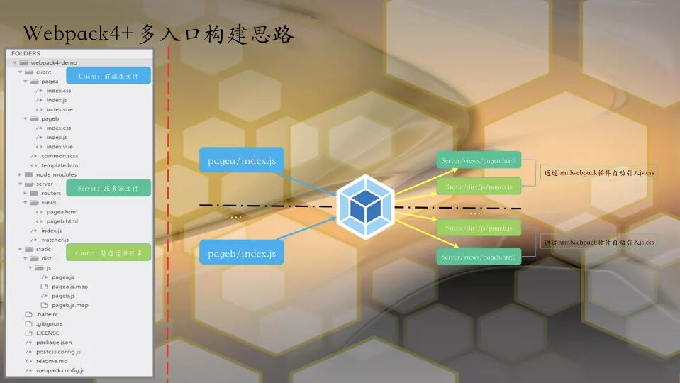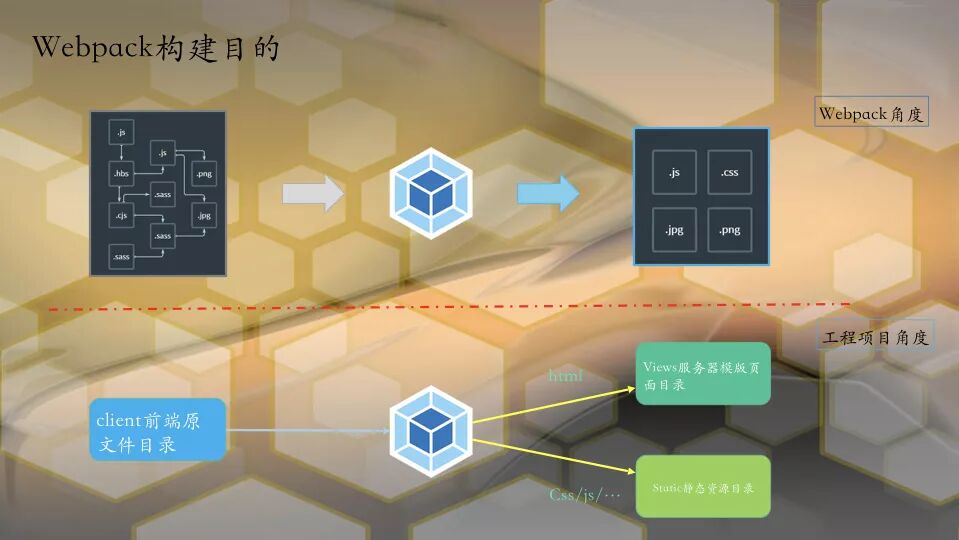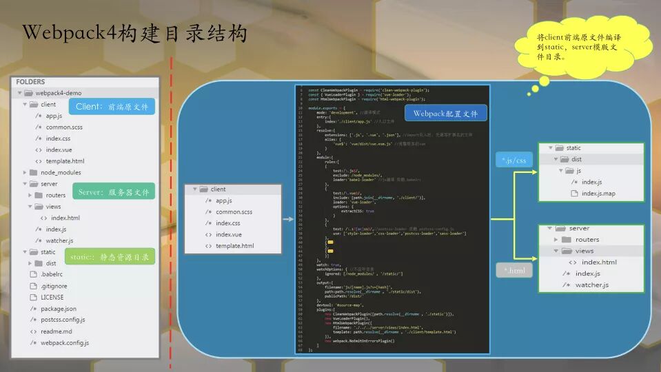 结合上面的目录结构图,如果说webpack的目的是将静态资源打包编译;那么在工程上,就是将前端资源client目录资源通过webpack构建到指定的static和server/views目录。
