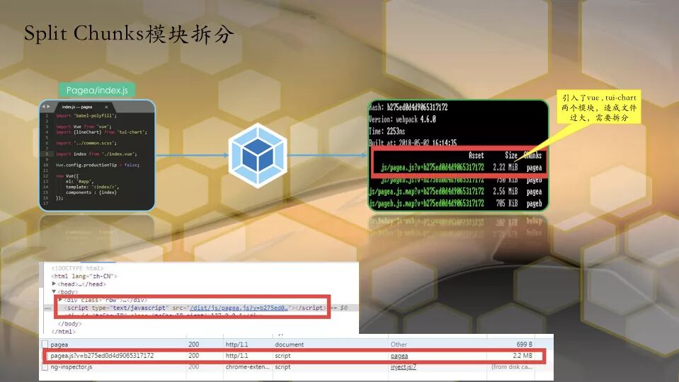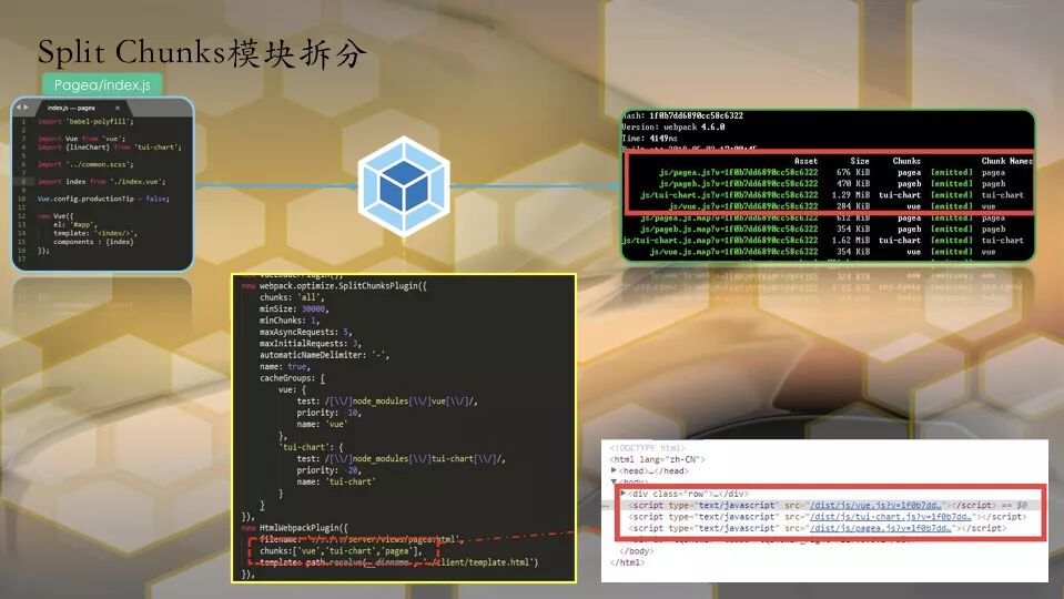 那么是时候引入文件拆分了,因为webpack4+之后,并不建议再使用CommonChunks模块,所以使用新的官方推荐的SplitChunks模块。
