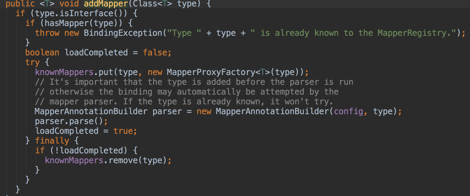 上图是DefaultSqlsessio中的类中,可以看到执行查询结果的是否,是Configuration中获取的MapperStatement对象,那么什么时候向Configuration中注册这个的呢?答案是扫描Mapper接口时候,这其实是第二篇中没有分析的,现在单独拿出来分析一下,