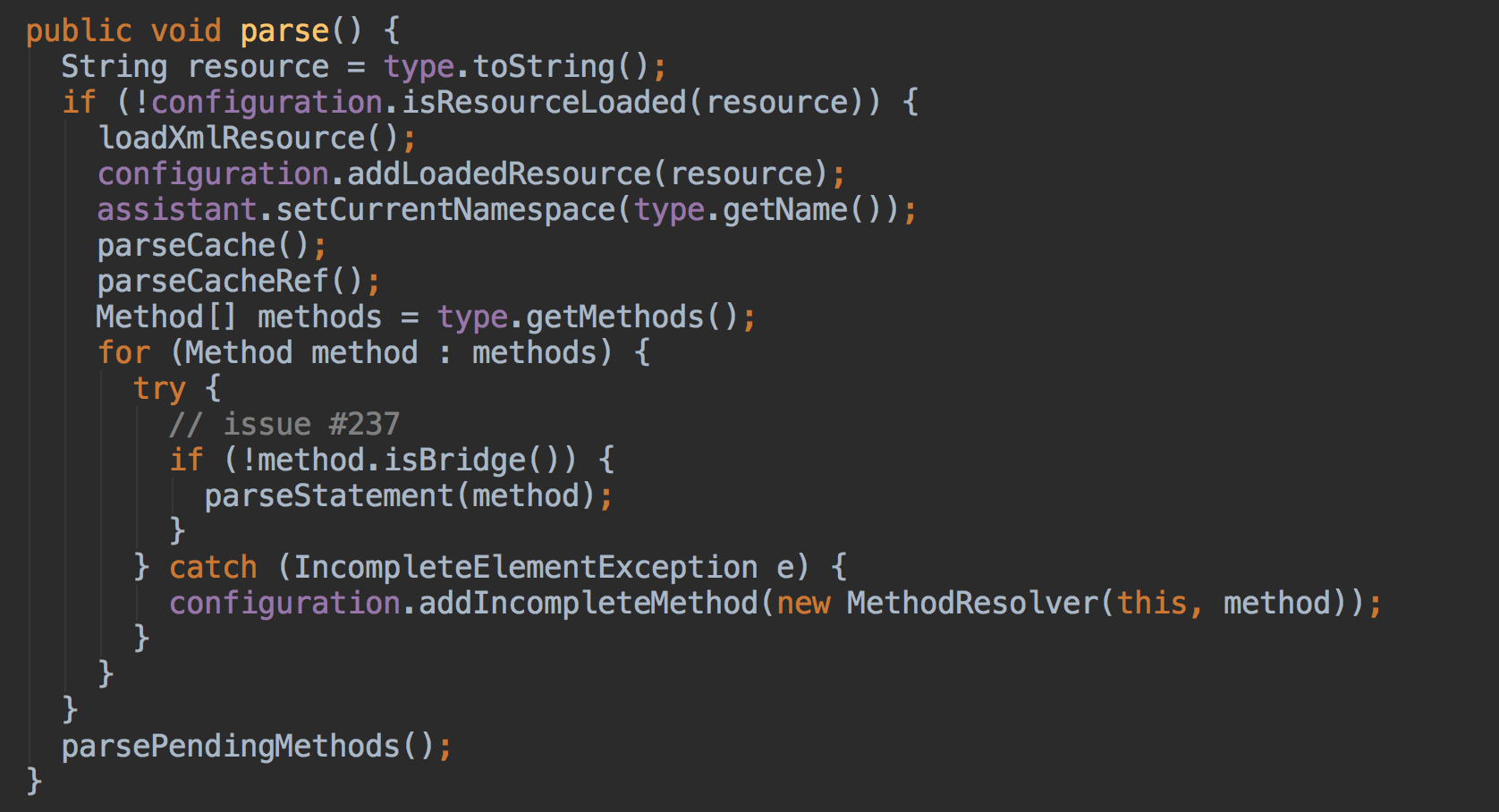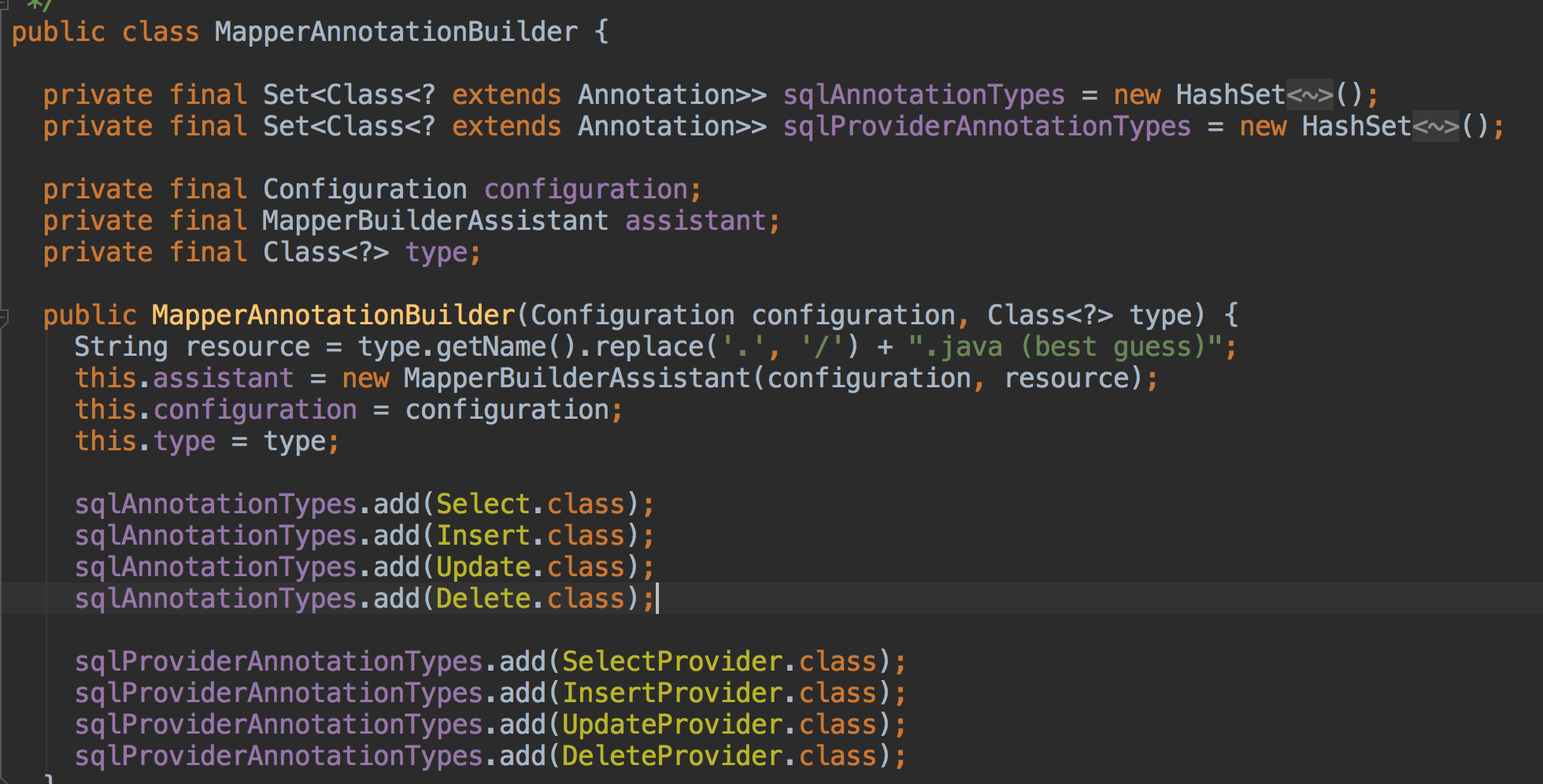 首先可以看到初始化这个这个类的时候,默认会解析的注解有八种,分别是@Select, @Insert @Update,@Delete等,接下来主要看一下parse函数的解析过程