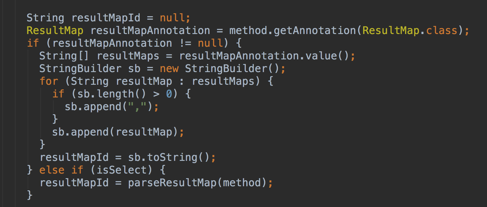 在看一下@ResultMap这个注解的作用,主要是映射结果Map的,这些做完了,这些做完,接下来最重要的是MapperBuilderAssistant类调用addMappedStatement方法,向Configuration中注册MapperStatement,
