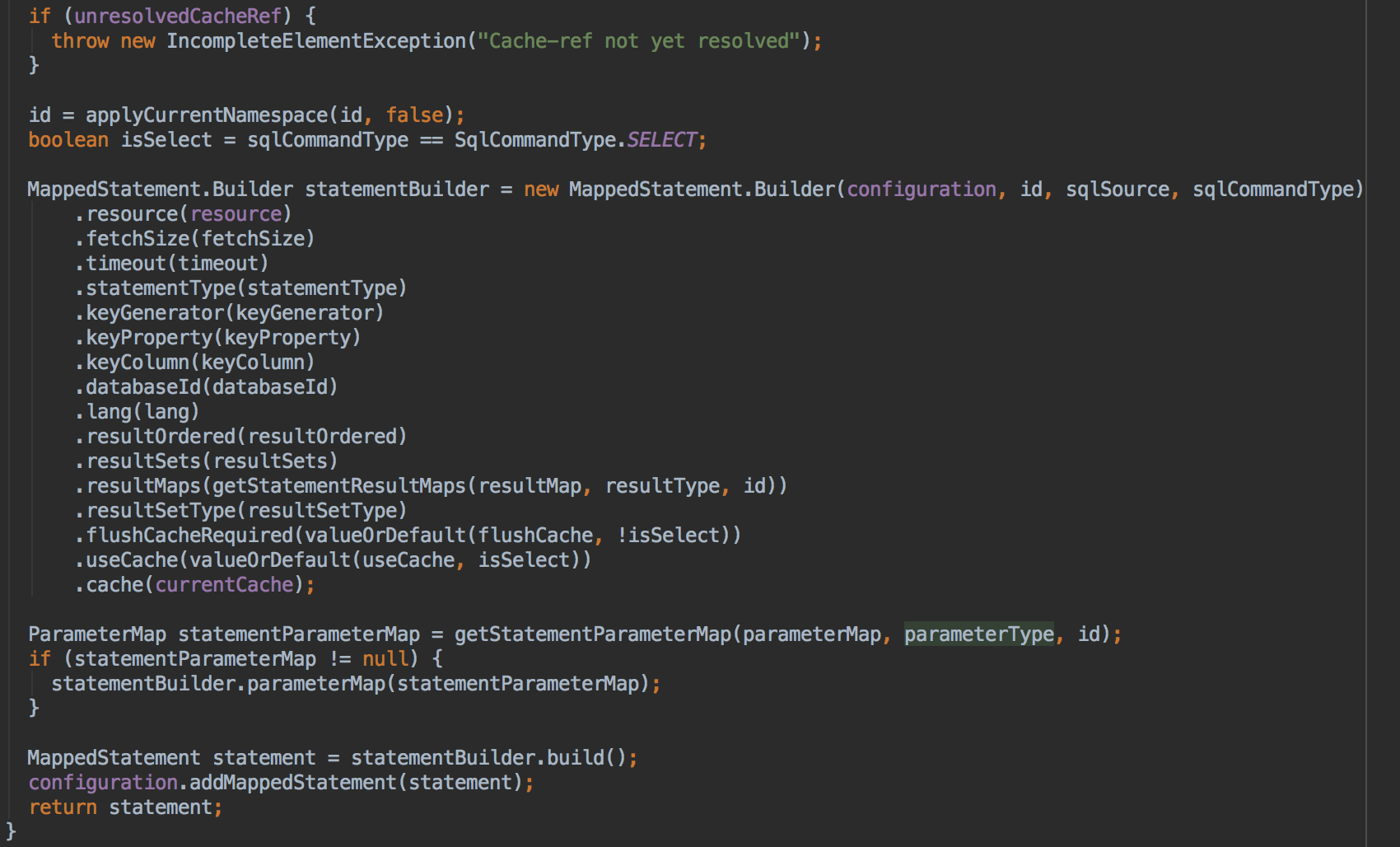 这里处理MapperStatement很简单,只是调用了MappedStatement.Builder这个建造者构造MapperStatement,并向Configuration中注册。
