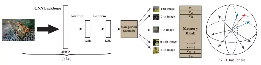图 2 非监督特征学习方法框图。我们使用 CNN 的骨干结构将每张图像编码成一个特征矢量,随后被投影到一个 128 维的空间,并进行 L2 正则化。最优特征内嵌函数通过实例级判别学习得到,通过尝试在 128 维的单位球面上最大程度地分散训练样本的特征。