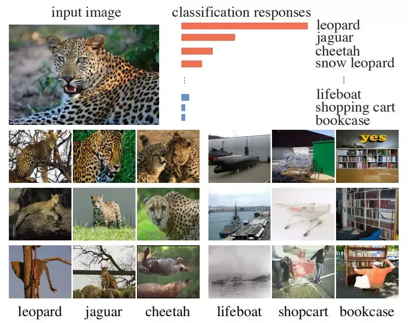 图 1 对于一张类别为“美洲豹”的图像,训练的神经网络分类器中得分最高的几类往往是视觉相关的,例如“美洲虎”和“非洲猎豹”。数据中的明显相似性拉近了这些类之间的距离。我们的无监督方法将类标级别的监督信息应用到极致,学习出能够区分单个实例的特征。