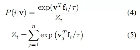 我们将 NCE 进行一定的修改,使其更适合我们的模型。为了解决需要与训练集中所有实例计算相似度这一难题,我们将多类别分类问题变成一系列二分类问题,二分类任务需要判别数据样本和噪声样本。在我们的模型中,存储组中的特征 v 对应第 i 个样例的概率为: