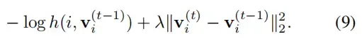 与传统的分类不同,我们的每一个类别下只有一个实例。因此每一个训练 epoch 每一类都只访问一次。因此,学习过程由于随机采样波动会产生大幅震荡。我们采用近段优化方法并且引入一个额外项鼓励训练机制的平滑性。在第 t 次迭代时,数据 xi 的特征表示从网络中计算得到: