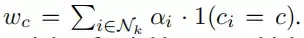 要分类测试图像 x,我们首先计算它的特征 f=fθ(x),然后将它和存储组中的所有图像的内嵌函数对比,使用余弦相似度 si=cos(vi, f)。前 k 个近邻,用 Nk 表示,随后被用于加权投票进行预测。类别 c 会获得一个总权重: