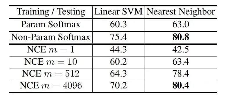 表 1 CIFAR-10 数据库的 top-1 准确率,通过对学习到的特征应用线性 SVM 和 kNN 分类器。我们的非参数 softmax 方法的分类效果远远超过了参数 softmax 方法,并且随着 m 的增加,NCE 的估计也越来越准确。
