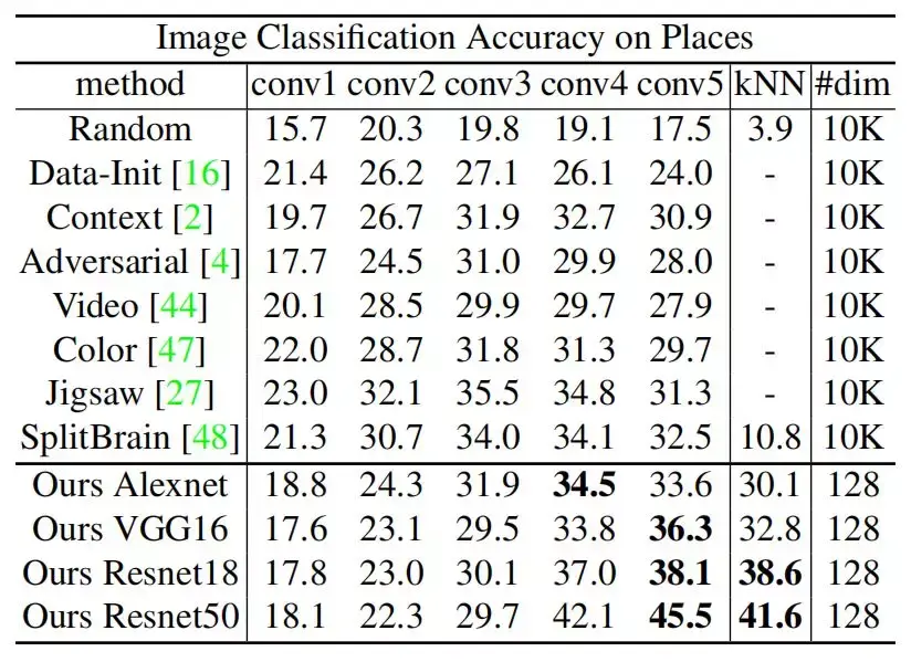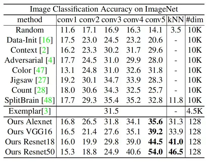 利用线性分类器对 AlexNet 的中层特征进行分类时,我们的方法准确率达到了 35%,超过了所有方法。并且我们的方法随网络深度增加,可以很好的扩展。当网络从 AlexNet 变成 ResNet-50 时,我们的准确率达到了 54%,而用样例 CNN 结合 ResNet-101 时,准确率也仅有 31.5%。