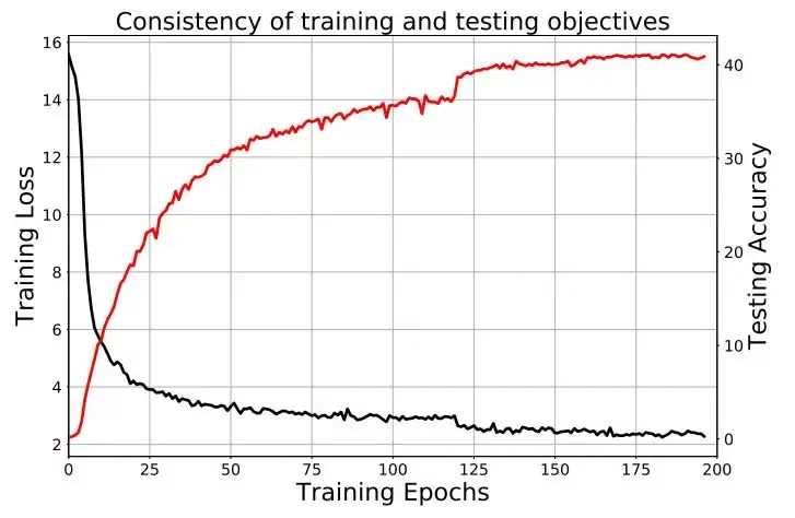 无监督特征学习一直是难点,因为测试目标对于训练目标来说时不可知的。一个好的训练目标在测试中会连续提升。我们研究了训练损失和测试准确率随迭代次数的关系。