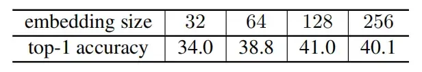 我们研究了内嵌特征维度从 32 到 256,算法效果的变化。表 4 显示,从 32 维开始,算法效果持续上升,在 128 维达到峰值,在 256 维趋于饱和。