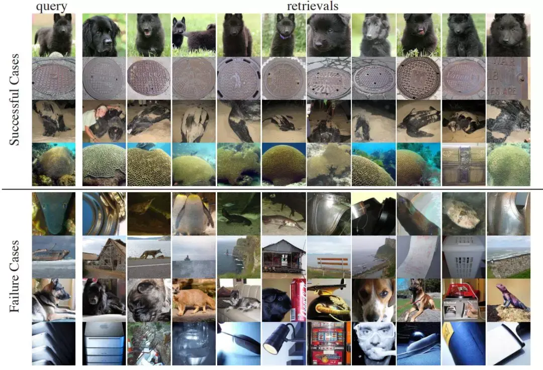 图 5 展示了用学习得到的特征进行图像检索的结果。上面 4 行显示的是最好情况:前 10 个检索结果都与查询图片属于同一类。下面 4 行显示的是最坏的情况:前 10 个检索结果中没有一个与查询图片属于同类。然而,即使对于失败案例,检索结果依然与查询图片具有很高的视觉相似性,这也证明了我们无监督学习目标函数的能力。