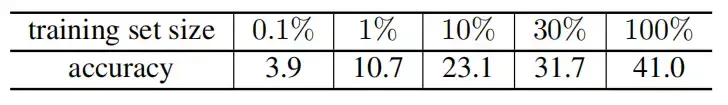 我们研究了学习到的特征提取网络是否可以应用于其他任务,以及它是否可以作为迁移学习的一个好的基础。一般的半监督学习方法是首先从大量无标注数据中学习然后在少量有标注类标上进行微调。我们从 ImageNet 中随机选择一个子集作为标注数据,剩下的作为无标注数据。我们进行半监督学习,然后在验证集上测量分类准确率。