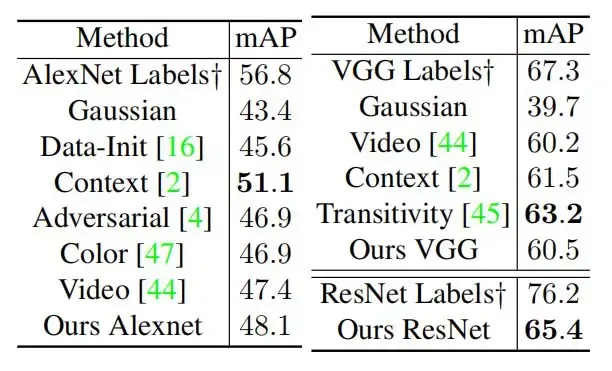为了进一步评测学习到的特征的泛化能力,我们将学习的网络迁移至 PASCAL 目标识别任务上。从零开始训练目标识别网络十分困难,常用的方法是在 ImageNet 上预训练 CNN,然后对其进行微调。