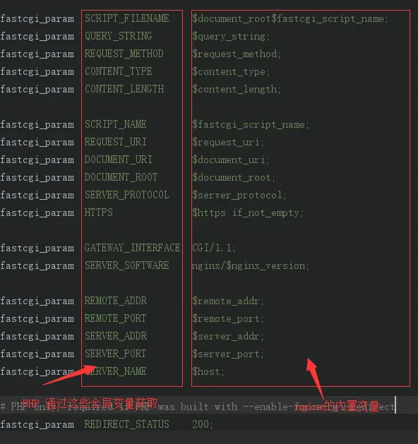 而且是以fastcgi模式运行PHP,所以nginx会将这些变量传递给fastcgi,而fastcgi又会将这些作为PHP的全局变量