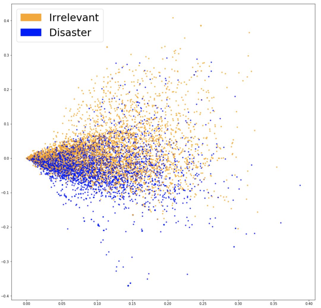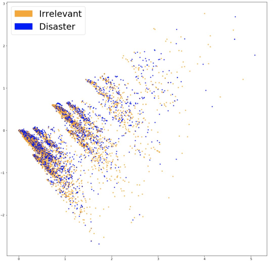 为了看出工作是否真正抓住了和问题相关的信息(比如推文是否与灾难相关),有一个好方法是将它们可视化,然后观察结果是否有很好的分布。考虑到词表通常很大,而且用 20000 维的数据做可视化是基本不可能的,所以我们使用了 PCA 这种技术将数据降到二维。绘制如下: