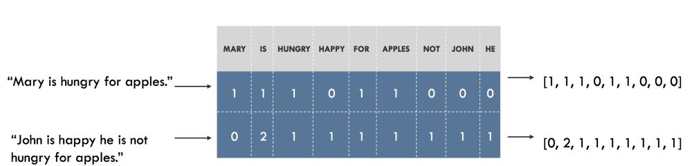例如,我们可以为数据集中的所有单词制作一张词表,然后将每个单词和一个唯一的索引关联。每个句子都是由一串数字组成,这串数字是词表中的独立单词对应的个数。通过列表中的索引,我们可以统计出句子中某个单词出现的次数。这种方法叫做 词袋模型,它完全忽略了句子中单词的顺序。如下图所示: