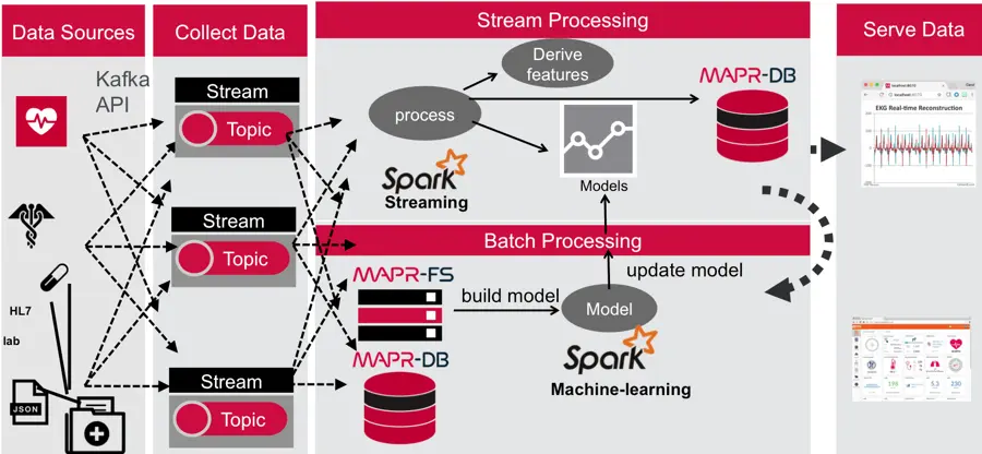 要理解IoT,流式数据和机器学习结合为什么可以提升医疗保健的效果,首先应当了解慢性疾病——如心脏病等是人类的主要疾病,人们的大部分医疗费用都是用在其上,而其中的关键是如何做好慢性疾病的护理以避免慢性病人不必要的住院。利用机器学习可以使用更便宜的传感器监控重要的生命体征,让医生更快地根据患者的病情开出更智能的药方,这一模式在低成本实现可扩展的慢性疾病管理上也具有着一定潜力。