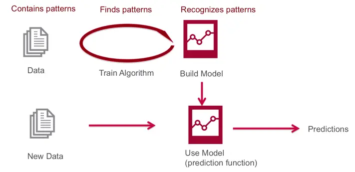 机器学习通过算法在数据中发现相应的模式(find patterns)并建模来识别这些模式(recognize patterns),从而在新的数据上进行预测(predict)。