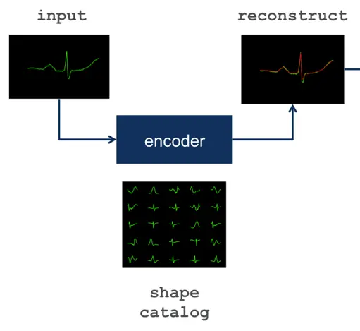 通过以上步骤,我们得到了一系列聚类中心图像构成的目录(catalog),我们可以用它来重建(reconstruct)一个心电图的数据,判断它与我们目录中的哪一个心电图波形最为相似。