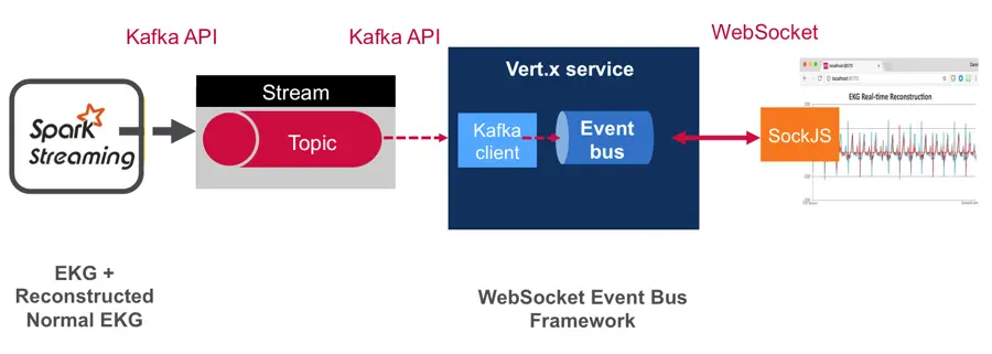 - Vert.x Kafka客户端消费来自MapR-ES topic的增强心电图数据并将在Vert.x的event bus上进行消息推送。