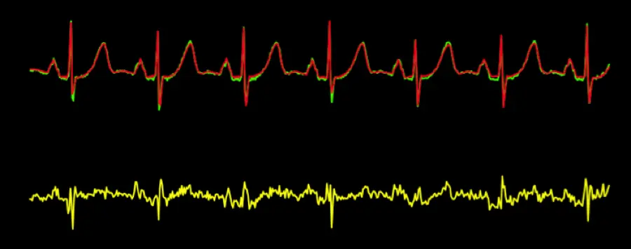 观测的心电图波形和预期的心电图波形之间的差值(绿色波形减去红色波形)即重建误差,也叫残差(对应下方的黄色波形),如果残差很大,那么可能出现了异常。