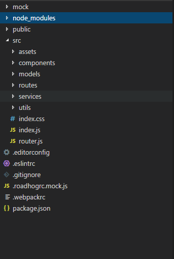 ├── .roadhogrc.js // 项目的配置文件,配置接口转发,css_module等都在这边。