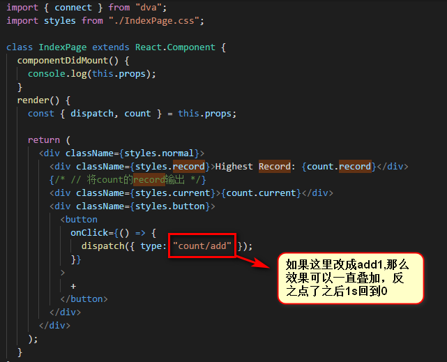 (7)在页面的模板 routes/IndexPage.js 中 + 号点击的时候,dispatch 一个 action