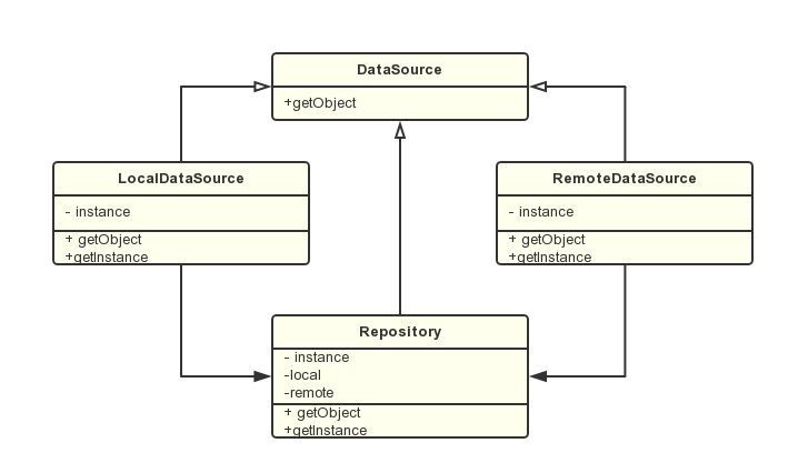首先Repository也是一个DataSource,它同样拥有getOject()的能力,而它对getOject()方法的处理,其实是借用了local和remote的能力,换个角度来看Repository就是remote和local的包装类,它做的只是实现了某部分业务逻辑:即,什么时候调用local和什么时候调用remote。由于Repository是对外统一接口对象,所以当内部业务逻辑发生改变,外部是无需关心的。
