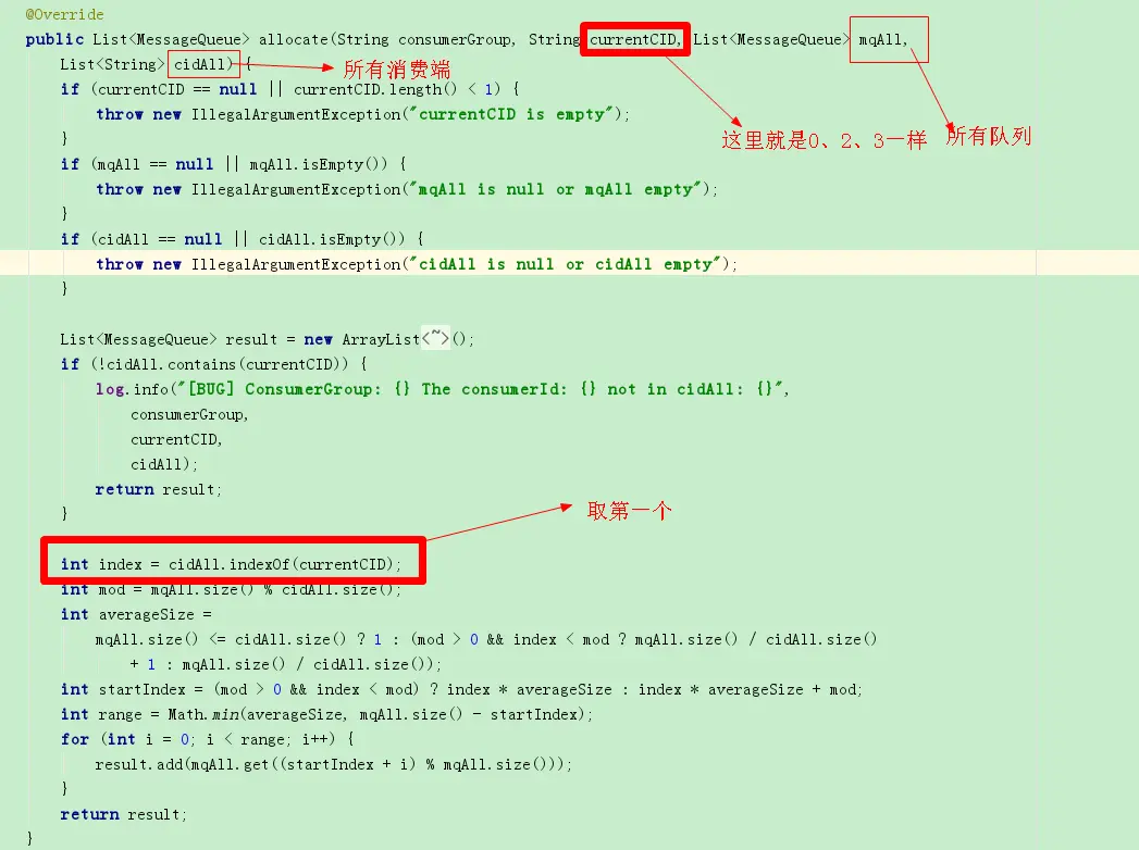 本篇不重点讲解源码过程,后续有空再慢慢分析源码部分,消费端为了实现负载均衡器,每次当有结点添加或者减少都会重新doRebalance,默认选择的就是获取所有队列以及得到对应group下面所有的cidAll(所有的消费端),之后类似于分页操作差不多……