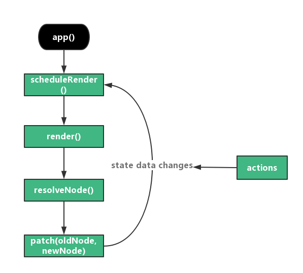 首先我们先从整体来看一下 Hyperapp 在调用 app 函数启动应用后的生命周期,如下图所示: