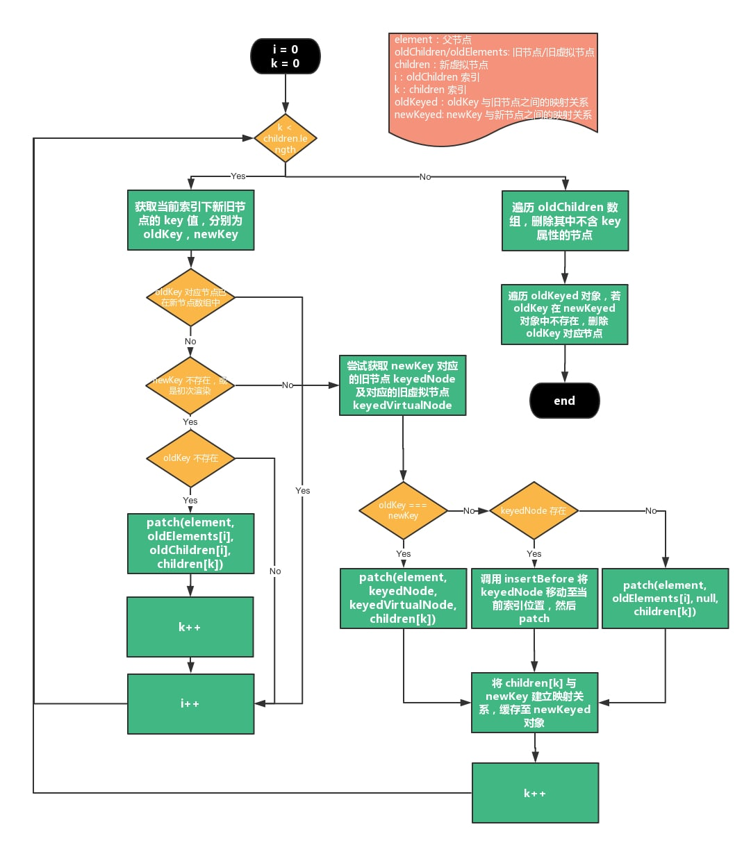 nodeName相同但二者不是同一节点,区别于情况一): 逻辑上是先更新节点属性,然后进入 children 数组中递归调用patch函数进行更新。不过 Hyperapp 为了提高性能,为节点提供了key属性。拥有key属性的 Virtual DOM 将对应特定的 DOM 节点(每个节点的key属性值需要保证在兄弟节点中中唯一 )。这样在更新时可以直接将其插入到新的位置,而不用低效率地删除再新建节点。下面的流程图说明了这里的策略: