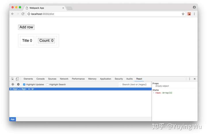 现在尝试在表格中添加一行。如你所见,页面上的每个元素周围都会显示一个边框。这意味着每次添加一行时,React都在计算和比较整个虚拟DOM树。现在尝试点击一行内的counter按钮。你将看到state更新后虚拟DOM如何更新 —— 只有引用了state key的元素及其children受到影响。