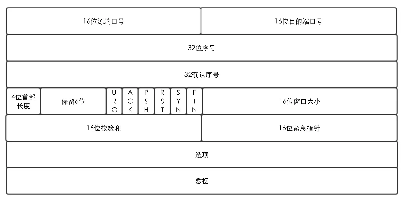 - 首部长度标识TCP包首部实际长度,它的单位是32bit【假如数字是6,那么表示头部实际长度是 4字节*6=24字节,由于首部长度只有4bit,最大数为15,因而最多有15*32bit=480bit=60字节】