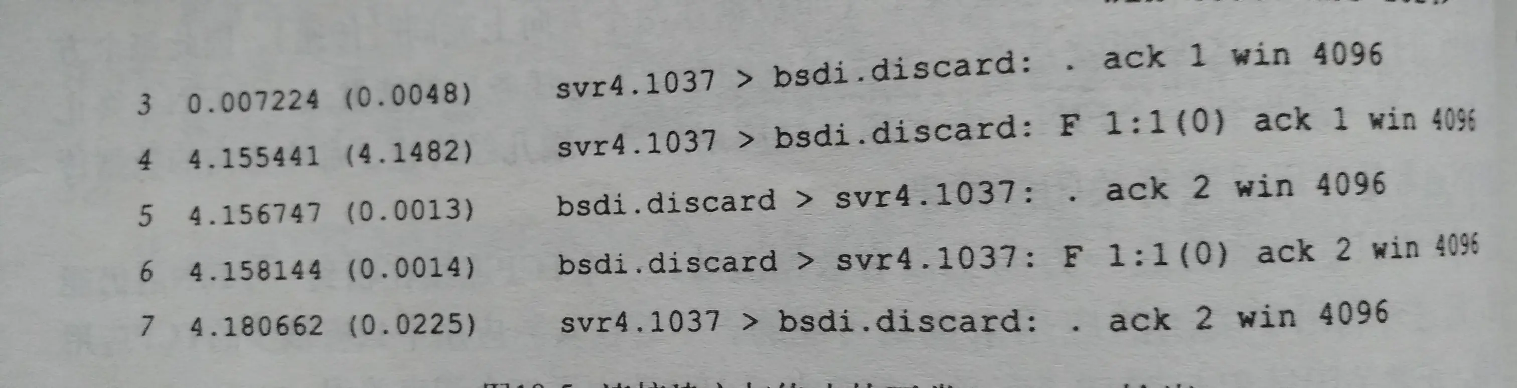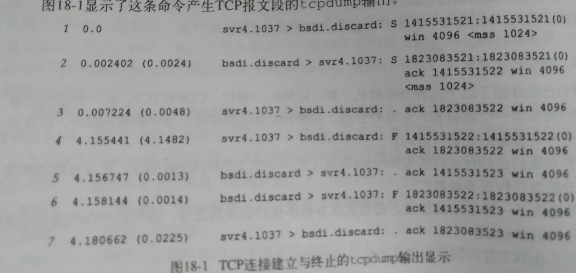 报文序号 报文产生时间(与上次报文的时间间隔) 源地址.端口号 > 目的地址 : 标识 分组序号:确认序号(报文段中字节数) 窗口大小 接收的最大报文长度- svr4.1037 > bsdi.discard 表示源地址的某个端口到目的地址