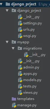 如图所示,我建立了一个名为django_project的工程,共添加了一个myapp的app模块(可以在app模块开发自己的小项目)