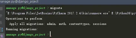 5.ctrl+alt+r打开shell,使用命令migrate,进行数据库的创建,并会生成auth,sessions,admin等数据表,后面的Django Admin需要这些数据表
