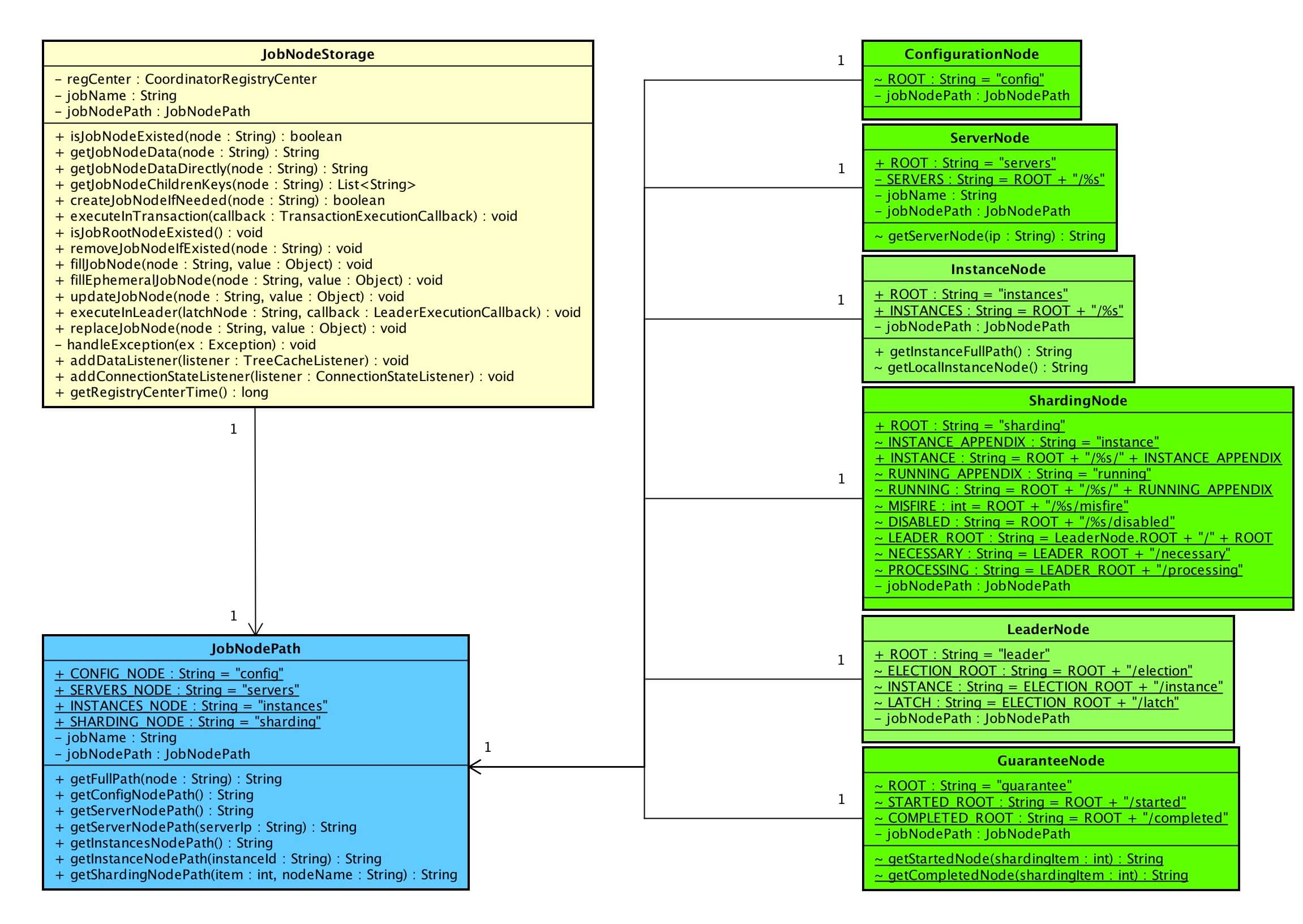 JobNodePath,注释很易懂,点击链接查看。这里我们梳理下 JobNodePath 和其它节点路径类的关系:
