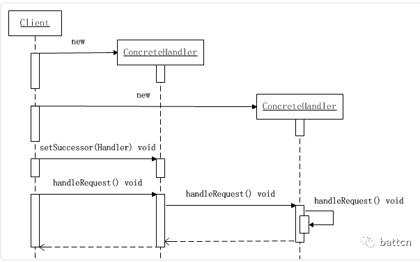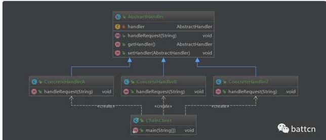 可以看出,客户端创建了三个 处理者对象,并指定第一个处理者对象的下家是第二个处理者对象,第二个处理者对象的下家是第三个处理者对象。然后客户端将请求传递给第一个处理者对象。