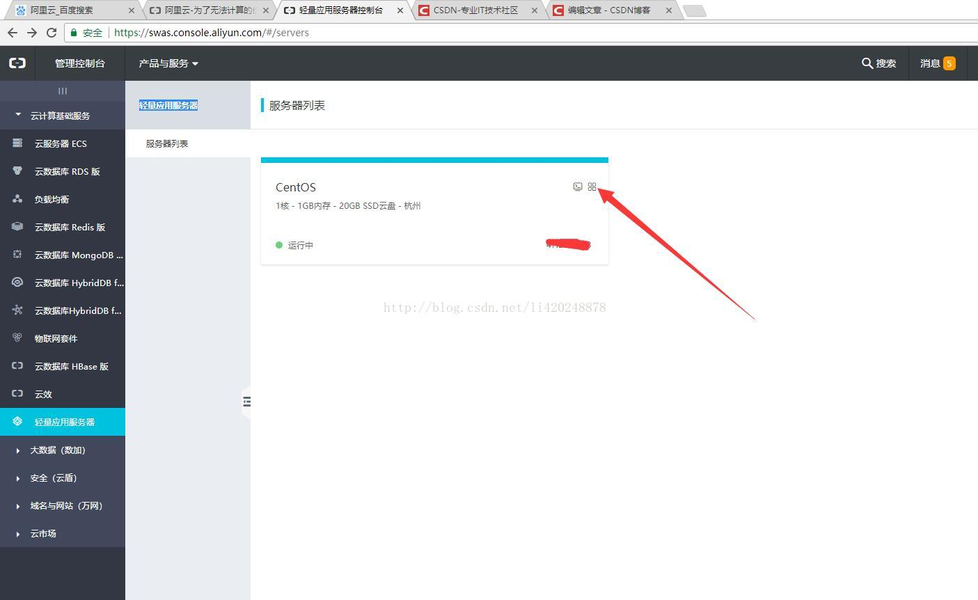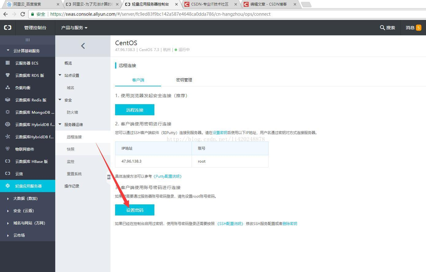 1、设置远程连接服务器(浏览器操作太别扭),控制台找到自己的轻量应用服务器,并设置远程连接密码