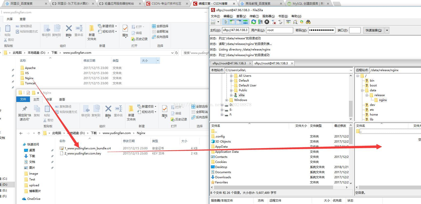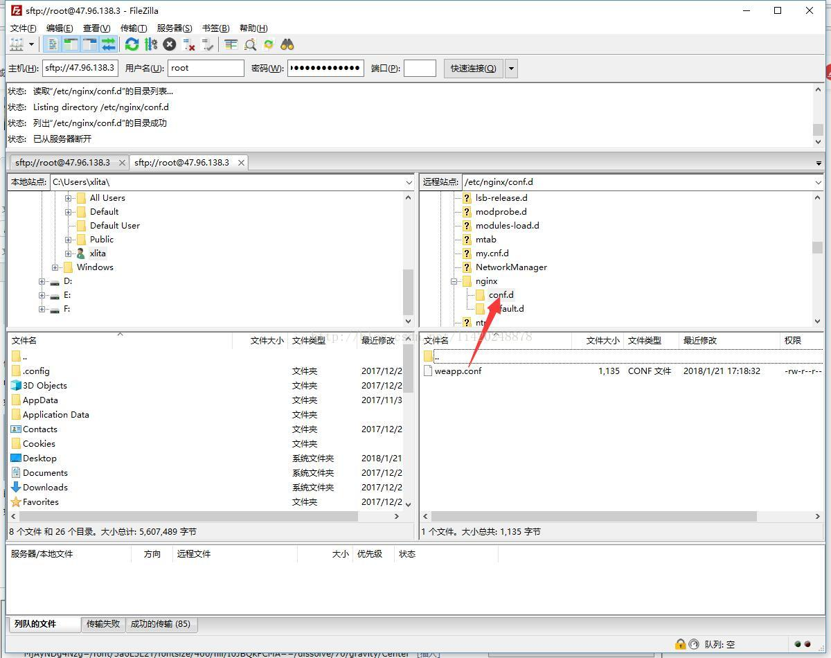 使用sftp软件(FileZilla)连接服务器,把ssl证书放到/data/release/nginx目录下