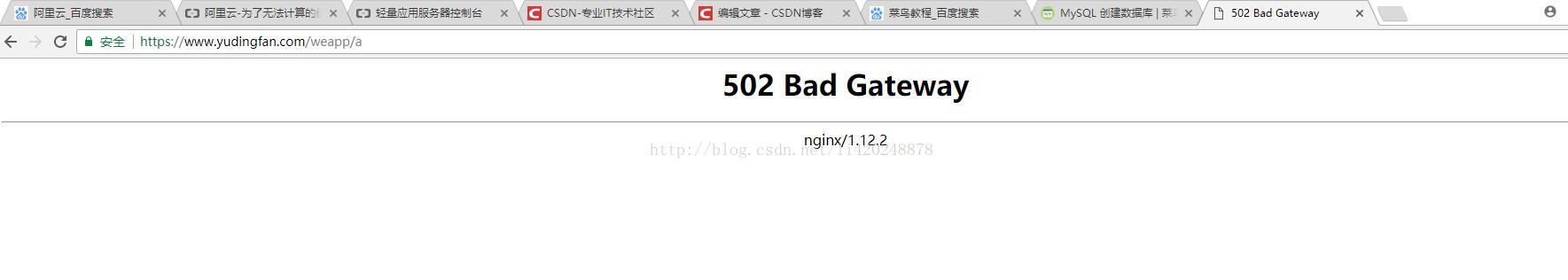 如果访问 http://你的域名/weapp/a 会自动跳转到 HTTPS 上,并显示 502 Bad Gateway,则表示配置成功: