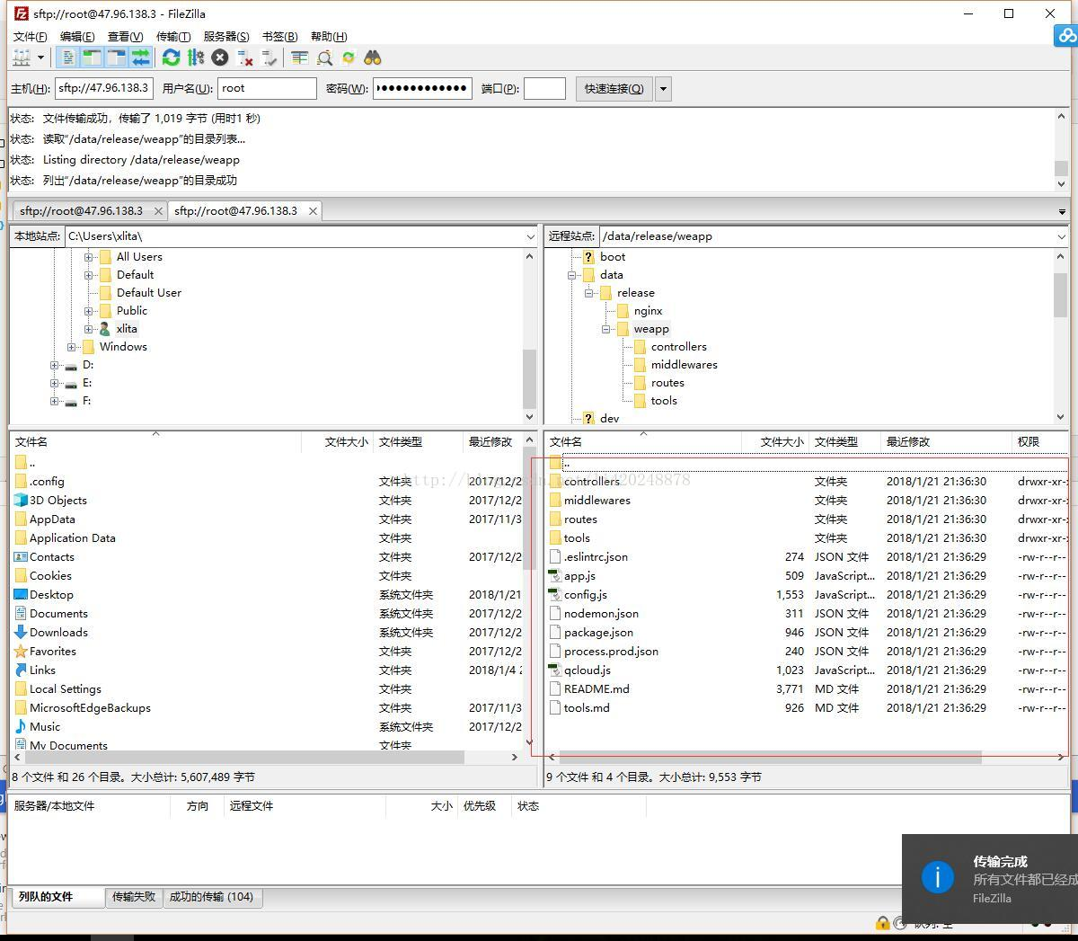 都配置好以后,现在需要将server端的代码上传的服务器上的/data/release/weapp目录下,