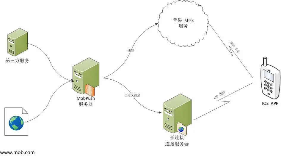 苹果官方推送通知服务,APNs 允许设备与苹果的推送通知服务器保持常连接状态。MobPush IOS的通知消息都是走APNs发送。